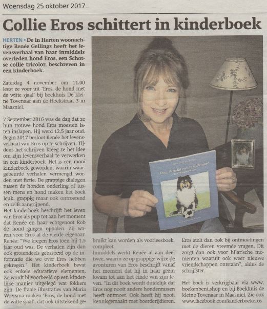 Media bericht in Via Limburg. De in Herten woonachtige Renée Gellings heeft het levensverhaal van haar inmiddels overleden hond Eros, een Schotse collie tricolor, beschreven in een kinderboek. Zaterdag 4 november om 11.00 uur leest ze voor uit 'Eros, de hond met de witte sjaal' bij boekhuis De kleine Tovenaar aan de Hoekstraat 3 in Maasniel.