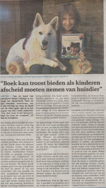 Media bericht in Via Limburg. Van de hand van schrijfster Renée Gellings is onlangs kinderboek 'Eros en zijn vrienden' verschenen. Het is een vervolg op 'Eros, de hond met de witte sjaal' dat ze in het najaar van 2017 uitbracht. Het boek kan troost bieden als kinderen afscheid moeten nemen van hun huisdier. Het levensverhaal van Eros is nu, volgens de schrijfster, compleet. Meer info over deel 1 en deel 2 en over Eros vindt u hier op Facebook: