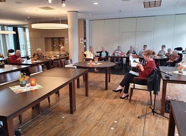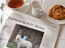 Voorlezen voor ouderen in Woonzorgcentrum Herten. Onze hond Douwe, alias Witje, gaat ook mee. Hij dient als figurant in het aangrijpende verhaal uit de bundel Hartlief, Komt wel goed Witje. Daarna is er gelegenheid voor de ouderen om Douwe te aaien of te knuffelen.